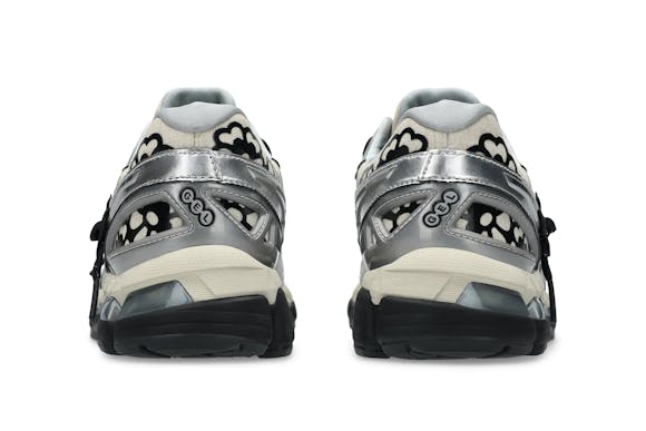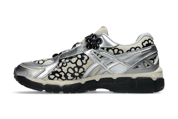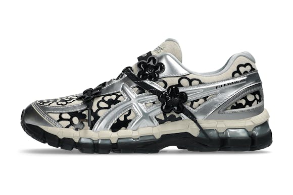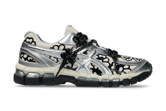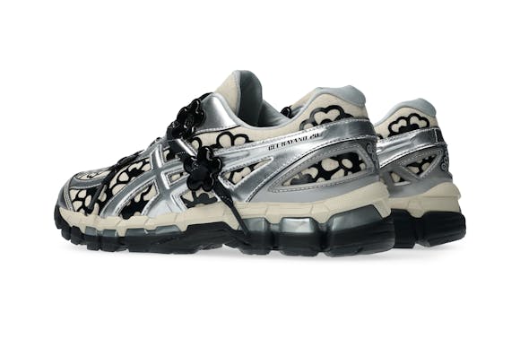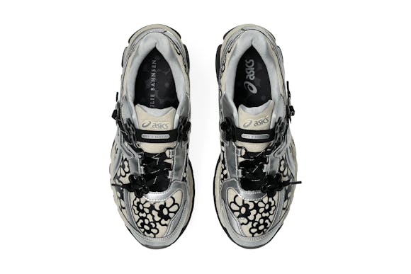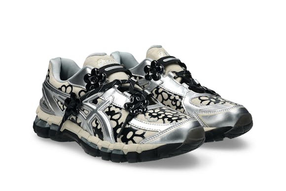 The CECILIE BAHNSEN X GEL-KAYANO 20 is available in two iterations: olive and vanilla/pure silver. The olive pair features a lightweight sheer mesh base printed with a metallic floral pattern, reflective laces, and shiny silver lining, contrasted with matte and gloss finishes. The vanilla/pure silver pair is built on a natural linen-look base layered with black glossy floral no-sew overlays and silver metallic accents, combining softness with structure in true Bahnsen style.